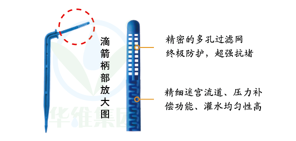 滴箭具有灌溉精準、出水均勻等優(yōu)點,廣泛用于茄果類蔬菜、水果、苗木、花卉等作物,是盆栽作物及立體綠化等最合適的灌水器。箭頭插入土壤或基質中固定導流;柄部插入內徑3mm左右的毛管中。